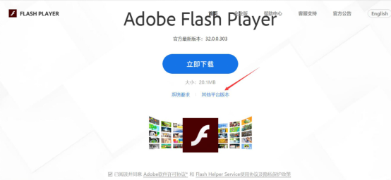 1、首先,用户进入Abode Flash Player插件的官方网站。为了避免所下载的flash插件与系统发生冲突,所以我们这里要点击界面上的“其他平台版本”。