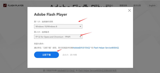 2、在flash插件弹出的安装窗口中,选择操作系统和版本之后,点击“立即下载”。要注意在选择版本时,例如360、UC、2355之类的浏览器都是选择PPAPI,如下图。