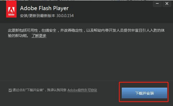 4、在安装flash插件的界面中,点击右下角的“下载并安装”按钮,电脑便会自动进行安装。