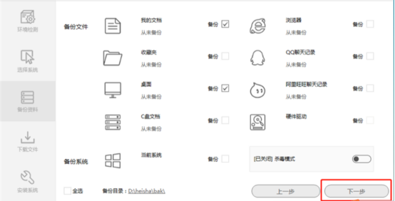 4、根据自身需要备份文件、系统、硬件驱动,然后点击“下一步”,如下图:
