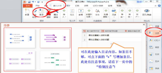 2、点击PPT美化大师的“目录”,选择其中一种符合用户要求的目录插入。
