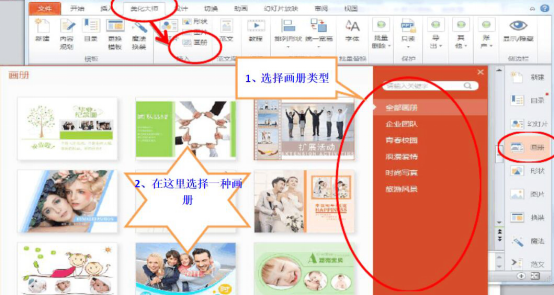 4、在PPT美化大师的“画册”选项中,用户可以根据自己所需要的图文排版方式,选择其中的一种或者多种插入到PPT中,即可生成一个PPT画册文档。一般来说,用户制作简单的PPT电子相册都会用到这个功能项。