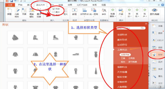 5、此外,用户还可以在PPT美化大师中插入各种形状让PPT看起来更清晰。点击“形状”,从形状的分类中,选择好自己想要的图形然后插入即可。