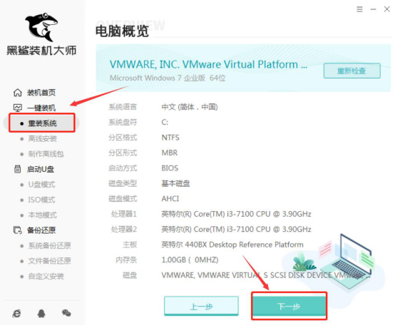 1、用户可以在本站下载黑鲨装机大师,安装并运行。在运行后的主界面,点击“一键装机”菜单下的“重装系统”。黑鲨装机大师便会展示当前电脑用户的系统配置。点击“下一步”按钮。