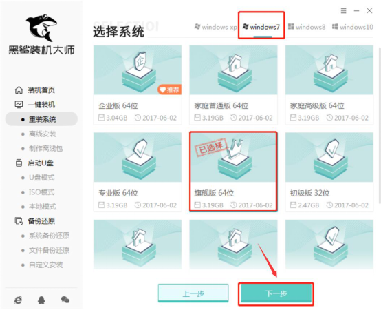 2、接着,黑鲨装机大师会弹出“选择系统”的界面。用户需要从中选择所要重装的系统。例如,本教程中是要重装Win7系统。那么,我们就需要从四大系统中点击“windows7”。