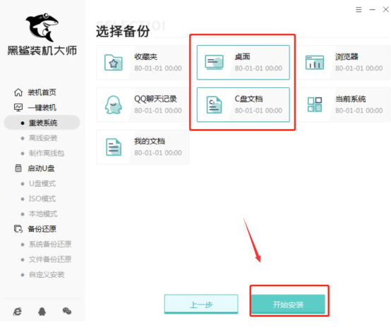 3、黑鲨装机大师重装系统,有一个非常人性化的方面,就是它具有备份的功能。用户可以选择需要备份的文件资料,之后点击“开始安装”的按钮,进入重装系统的下一步操作。