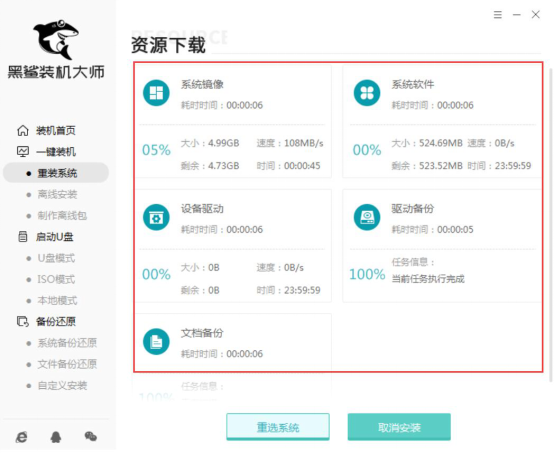 4、接着,黑鲨装机大师便开始将所选择备份的文件资料、系统软件等进行资源下载,用户可以清晰地从中查看下载的进度。