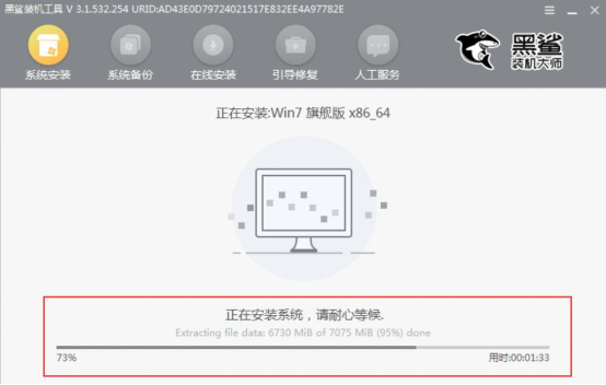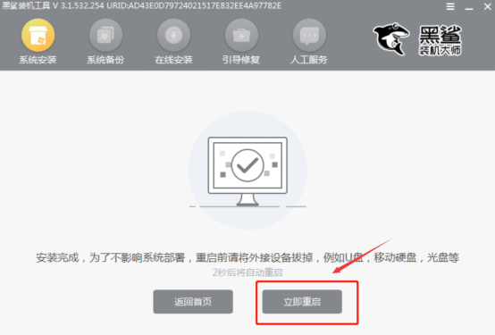 5、上一步资源下载完毕后,黑鲨装机大师便开始进行重装系统的安装部署工作。部署成功后,用户要将电脑重启。这样,黑鲨装机大师重装系统才能成功。