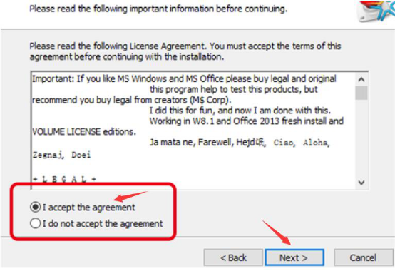 3、用户想kmspico正常使用,这里便需要勾选“I accept the agreement”,然后再点击 “Next”按钮。