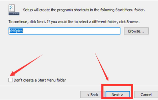 5、到了这一步,在kmspico弹出的如下图窗口中,记得不要勾选“Don`t create a Start Menu folder”,然后点击“Next”按钮。