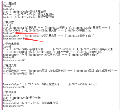5、打开customkeys记事本,你会看到所有的建筑物建造、英雄升级、释放技能的快捷键设置都在这里,例如想修改大法师的暴风雪快捷键,它默认是B,将其改成F,