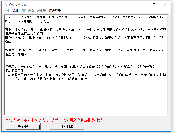 打开软件,进入界面,在文本框中直接复制粘贴文字内容,然后点击【进行分析】,软件开始解析论文,结果如图,