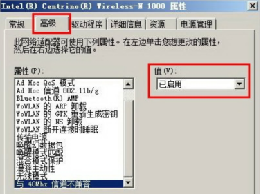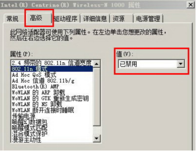3、点击画红线部分,在弹出界面点击“高级”,选择“802.11n 模式”,值选择“已禁用”,“与40Mhz信道不兼容”的值选择“已启用”,如下图: