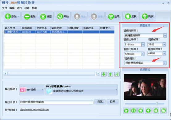 4、mkv可以无损转换mp4格式。在“预置选项”中,分辨率保持原分辨率,视频的缩放也保持原视频模式。一般来说,视频的比特率、帧率、采样率设置的参数越高,mkv转换出来的mp4格式视频便会越清晰。