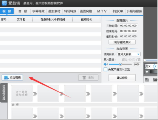 1、打开电脑上安装的“爱剪辑”软件,点击“添加视频”,也可以直接将视频拖入到软件中,如下图: