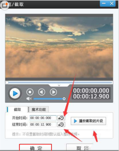 3、弹出一个预览视频的界面,点击“开始”、“结束”后的按钮可以快速选择开始、结束剪辑的时间点,设定好后可以点击“播放截取的片段”试听下,然后点击“确定”,剪辑就完成了,如下图: