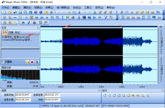 3、接下来,在音乐编辑器Magic Music Editor的左侧栏“文件”中,点击选中该音乐。同时,在右方可以拉动两个倒立的三角形符号来调整所需要剪切的音乐部分。将选区确定后,可以点击音乐编辑器Magic Music Editor菜单栏的“播放”进行试听。