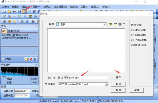 6、确认所剪切的音乐部分无误后,用户点击“保存”快捷按钮将剪切后的音乐进行保存。在另存为的窗口中,重命名文件名并点击“保存”即可完成音乐编辑器Magic Music Editor剪切音乐的全部操作。