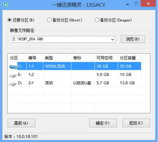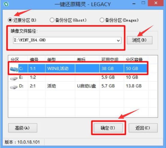 2、一键还原精灵会自动寻找U盘中的ghost系统镜像包。用户需要选择还原分区、点击“浏览”选择映像文件路径、选择C盘作为还原分区,再点击“确定”。
