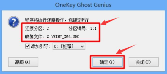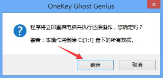 3、接下来,会弹出如下图的提示对话框。用户需要确认还原的磁盘信息,再点击“确定”,一键还原精灵便开始执行还原电脑的操作命令。