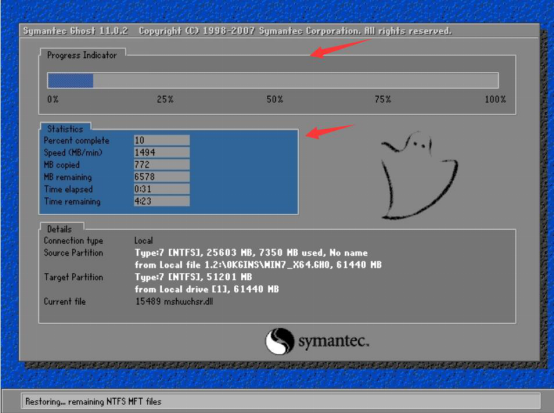 5、一键还原精灵在还原电脑的过程中,无需用户进行任何操作,用户可以在如下图的界面中实时了解还原电脑的进程。
