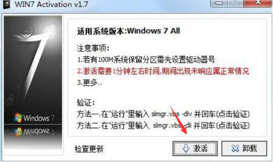 3、接下来,win7 activation会弹出激活或者卸载的提醒窗口。在窗口中,点击“激活”按钮,从而进入激活操作。整个激活的过程大概1分钟左右。