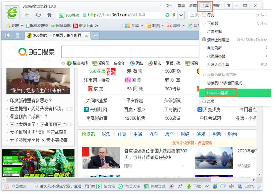 本教程需要用到360浏览器,打开浏览器,进入界面,点击上方的【工具】——【Internet选项】,如图,