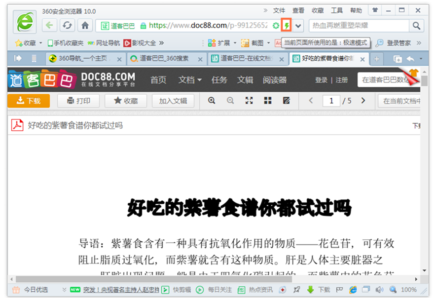 然后回到360浏览器,如图,在网址区域点击闪电图标,即可知道当前页面使用的是【极速模式】,