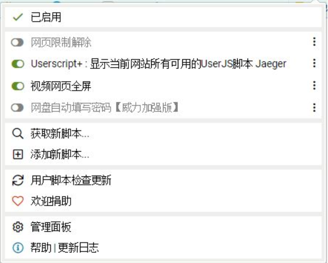 2、安装完成,脚本会在有效的网站上自动启用,在浏览器扩展栏可以查看、管理脚本,如下图: