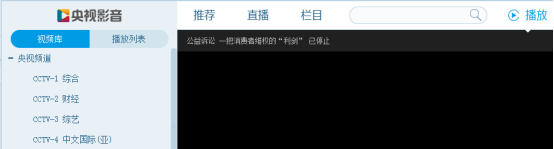 2、cbox央视影音左侧是视频库和播放列表,可以选择自己想看的视频,界面的最上面有推荐、直播、栏目,可以直接点击选择自己喜欢看的视频,点击搜索框可以搜索视频,还有播放按钮,如下图: