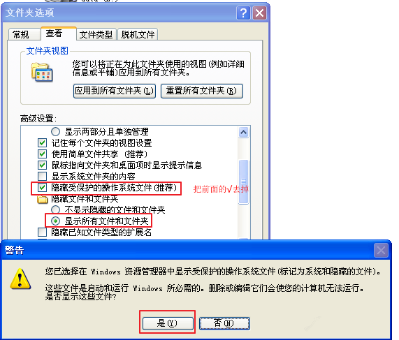 如图,切换【查看】标签,取消勾选【隐藏受保护的操作系统文件(推荐)】,出现提示,选择【是】,即可显示被隐藏的操作系统文件,