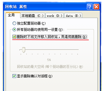 鼠标右击回收站,弹出菜单,选择【属性】,如图,勾选【删除时不将文件移入回收站,而是彻底删除】,