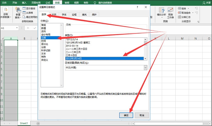 2、打开【设置单元格格式】面板,如图,切换【数字】选项卡,点击【日期】,然后找到自己需要的日期格式,点击确定即可,