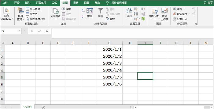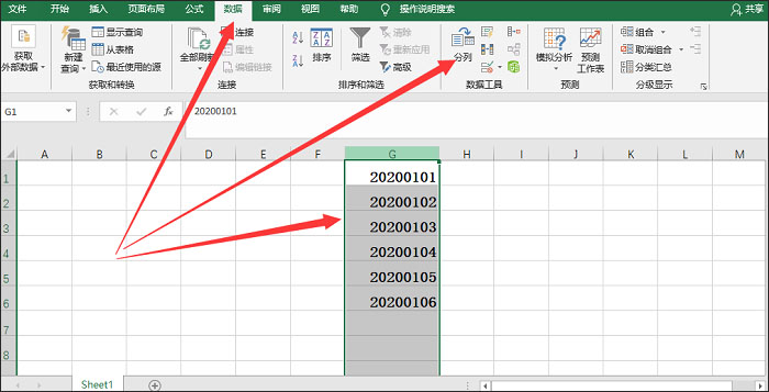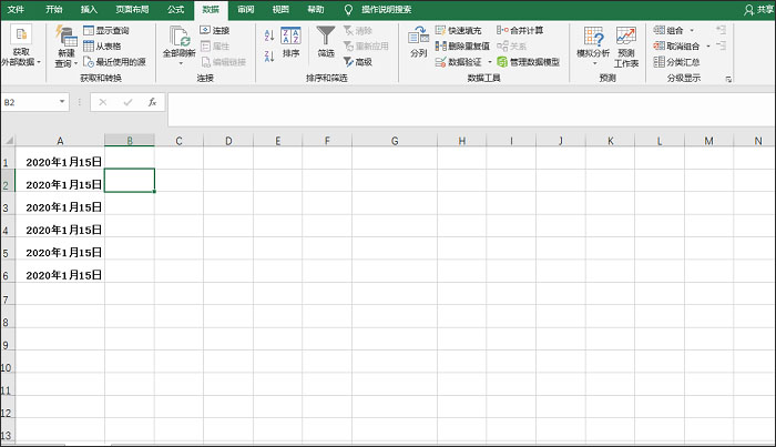 1、打开一个Excel表格,在单元格中输入相关日期,然后选择目标区域,在菜单栏中点击【数据】——【数据工具】——【分类】功能,