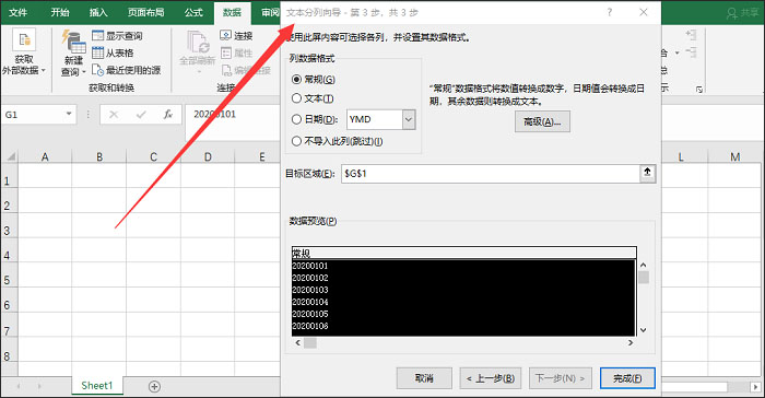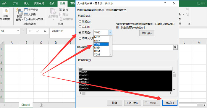 3、如图,在【列数据格式】选项中勾选【日期】,接着在下拉框中选择YMD,点击完成,