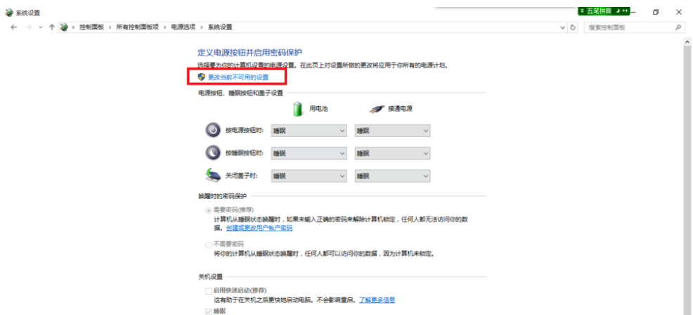 2、进入如图界面,点击【选择电源按钮的功能】,然后点击【更改当前不可用的设置】,取消勾选【启用快速启动(推荐)】,点击【保存修改】,