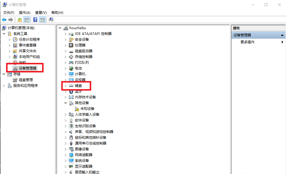 2、进入计算机管理界面,依次点击【性能】——【设备管理器】——【键盘】,