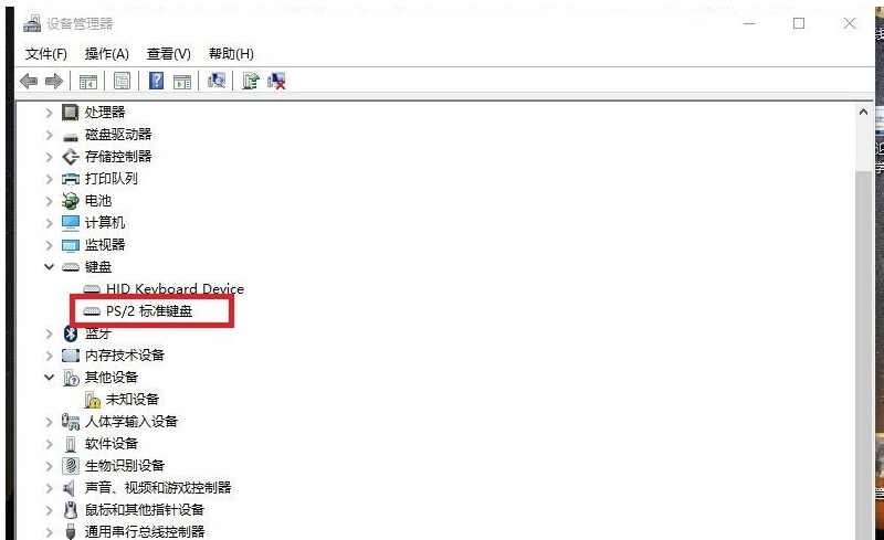 3、如图,点击展开【键盘】选项,这里有HID keyboaed divice、PS/2 标准键盘,选择删除【PS/2 标准键盘】,