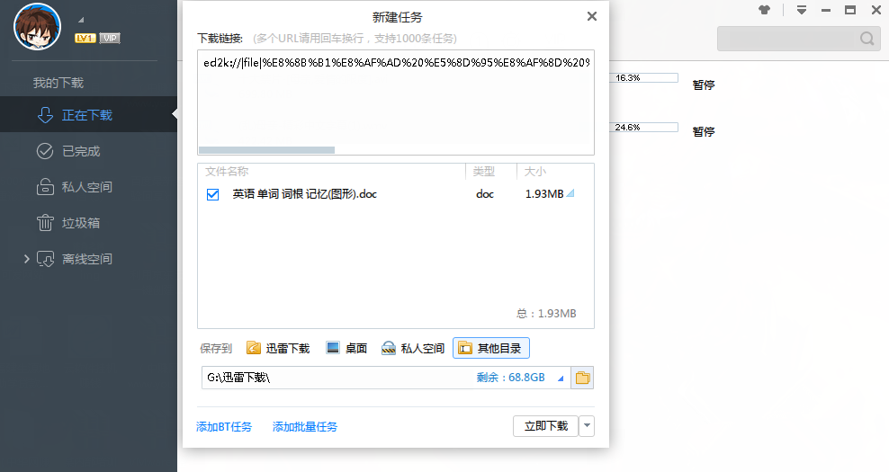 如果你的电脑中安装了迅雷,并且已经打开软件,则会自动弹出新建任务窗口,如图,点击【立即下载】即可,下载完成,解压解压包,就会得到你需要的资料。