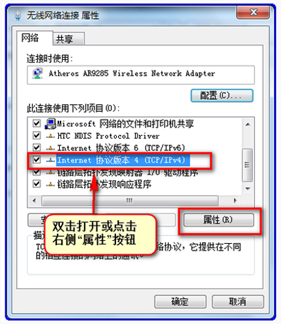 3、鼠标右击【无线网络连接】,选择属性,弹出窗口,如图,双击【 internet协办议版本4( TCP/IPy4)】,或者点击右侧的【属性】按钮,