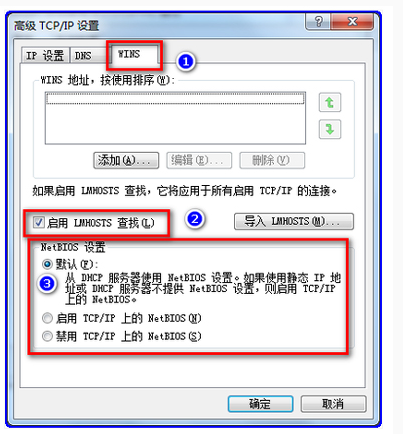 5、如图,点击WNS选项卡,勾选【启用 LMHOSTS查找】,点击【NetBIos设置】,勾选默认选项或者【启用 TCP/IP上的 NetBios】,点击确认,