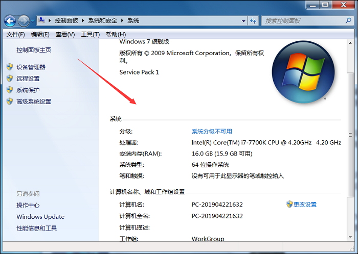 2、进入以下界面,你就可以看到当前使用电脑的基本信息,包括处理器、内存、系统类型等等。