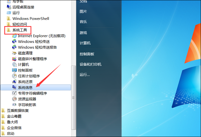 1、呼出开始菜单,依次点击【所有程序】——【附件】——【系统工具】,找到并点击【系统信息】选项,如图,