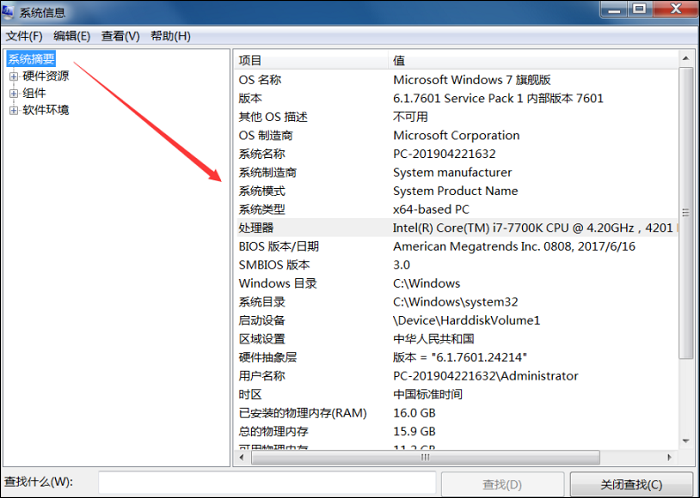 2、进入系统信息界面,点击右侧的【系统摘要】,即可显示电脑配置信息,点击【硬件资源】、【组件】、【软件环境】,可以查看电脑系统的其他信息。