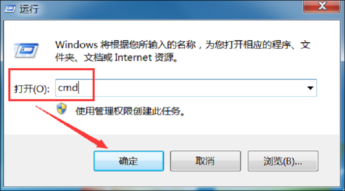 1、点按快捷键【Windows+R】,打开运行对话框,输入cmd命令提示符,点击确定,进入磁盘操作系统,
