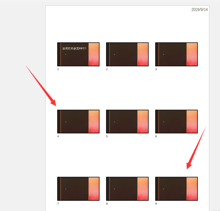 设置完成,你可以在打印预览界面看到具体效果,在一个页面中打印9张幻灯片,如图所示,