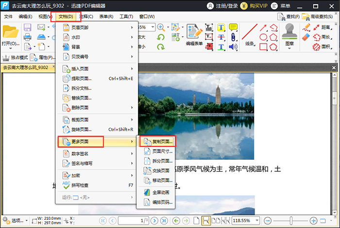 打开迅捷PDF编辑器,进入界面,导入PDF文件,在菜单栏中点击【文档】——【更多页面】——【复制页面】选项,如图所示,