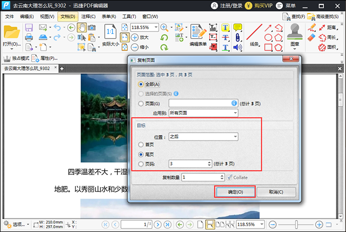 接着对【目标】进行设置,选择复制页面的目标位置,设置完成,点击确定即可,