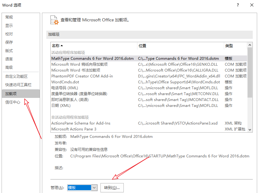 进入【Word选项】面板,点击左侧的【加载项】,然后在右侧点击【管理】——【模板】,点击【转到】,