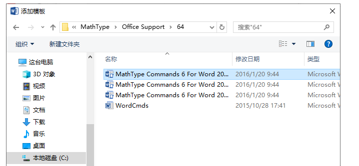 打开对话框,找到MathType安装路径中的Office Support文件夹,选择MathTypeCommands6ForWord 2010,点击添加这个文件,